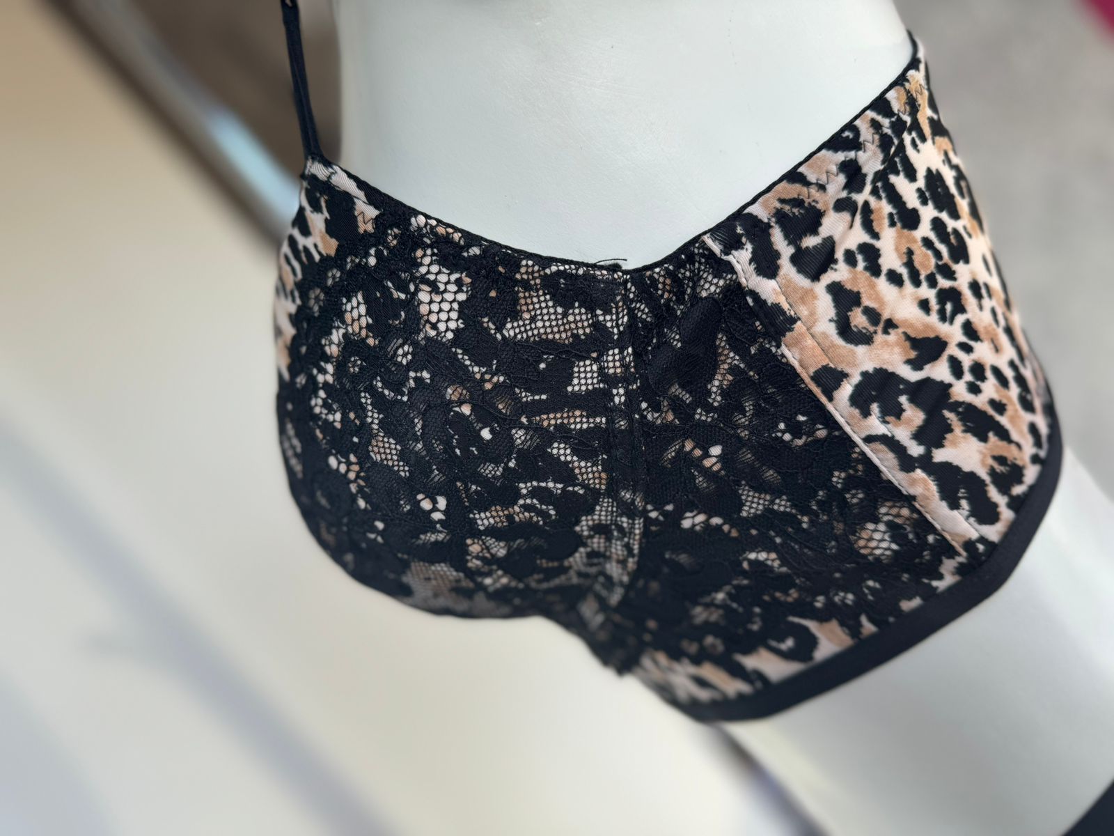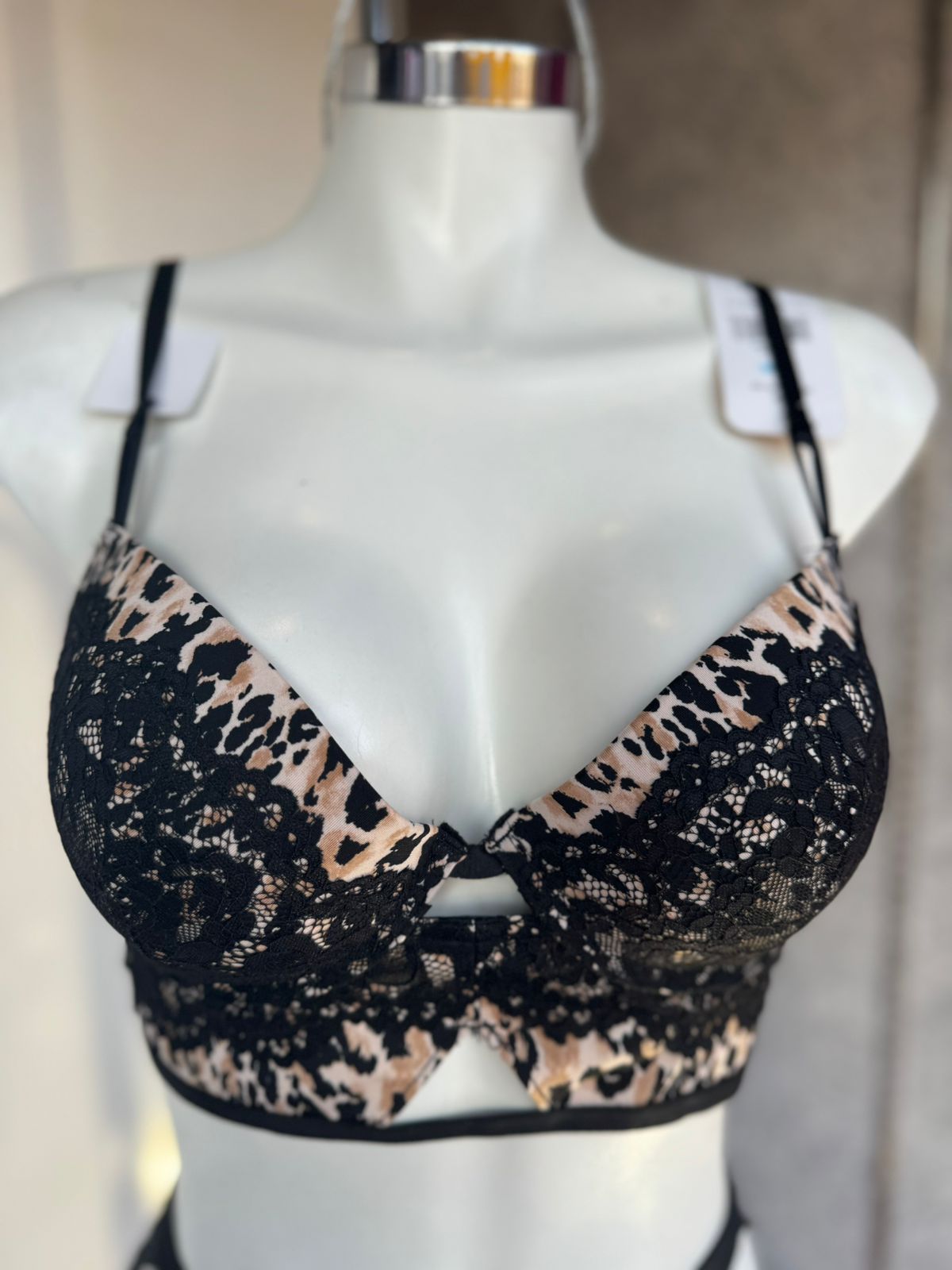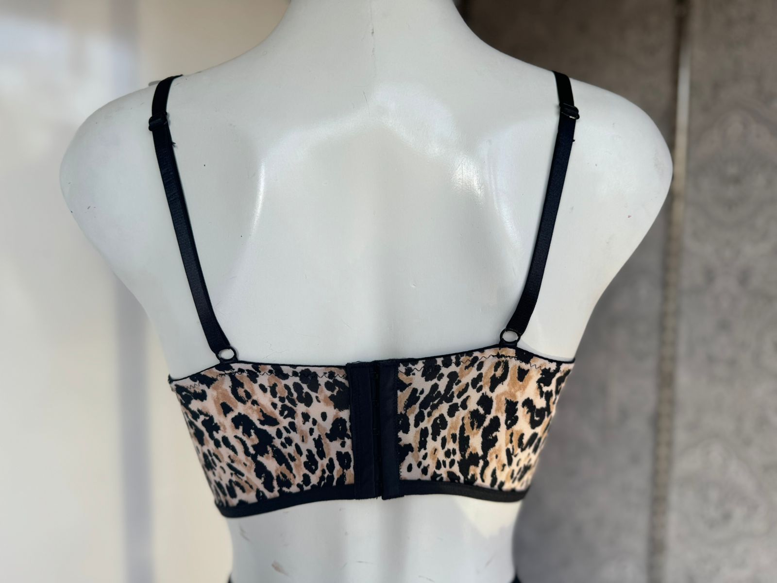 Coqueto bra con varilla, copa preformada y de peto largo. Estampado animal print con detalles en encaje negro.