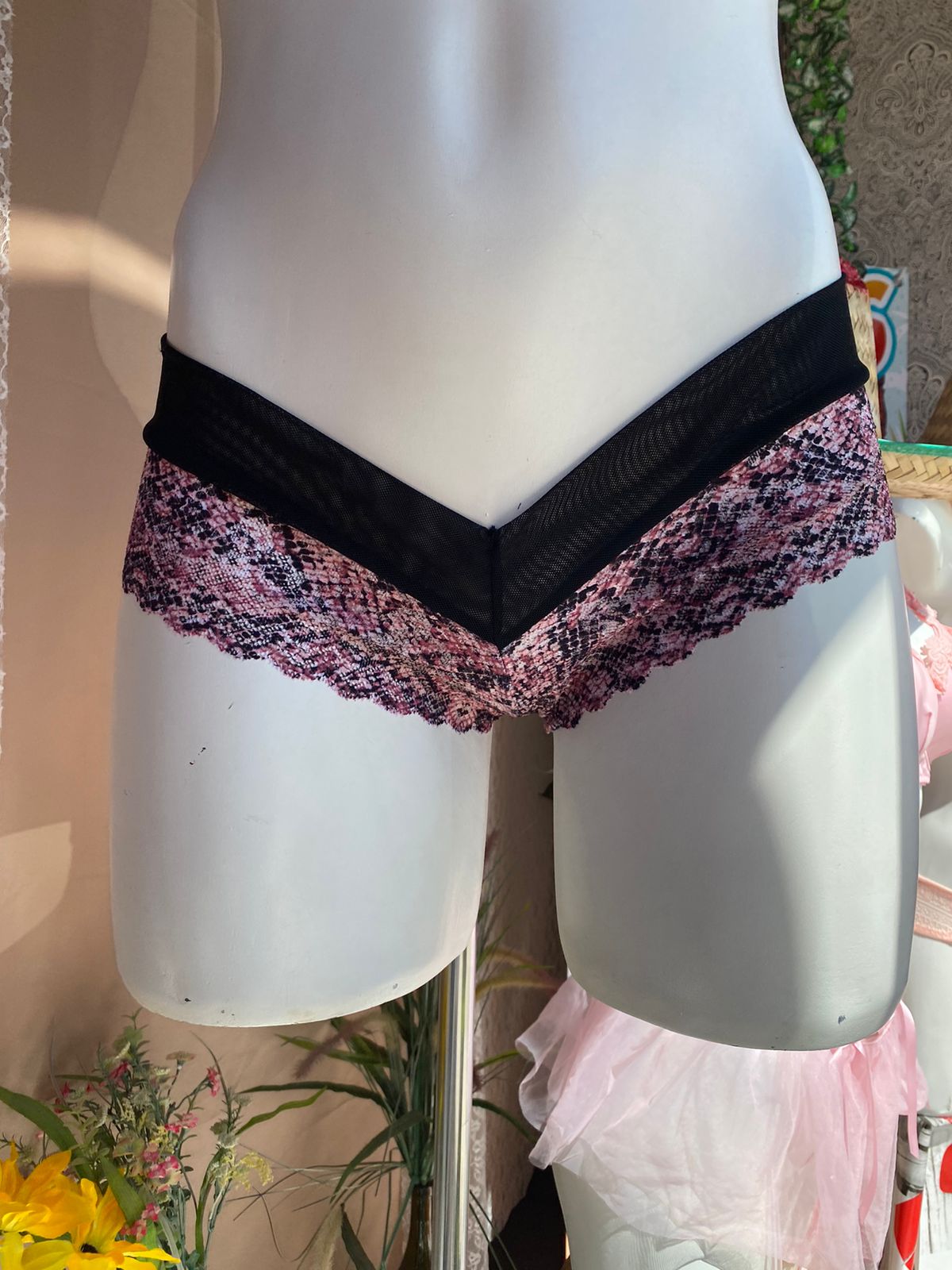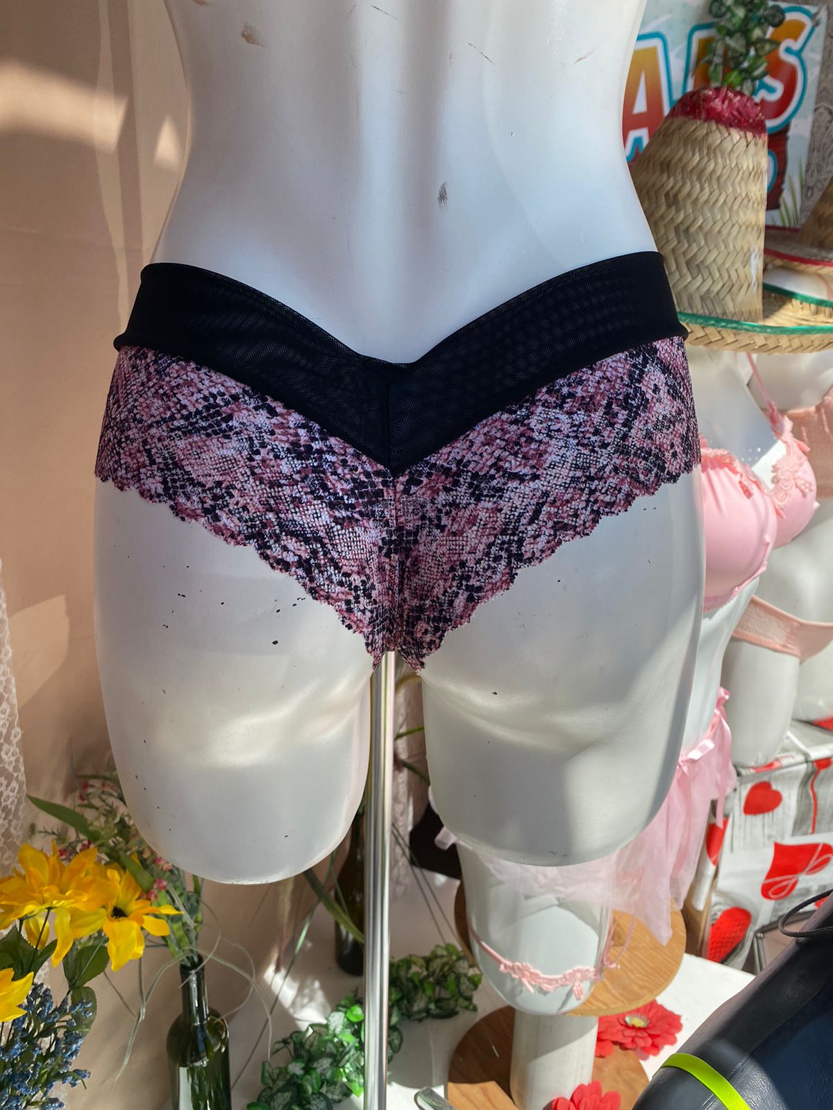 Súper sexy cachetero en encaje animal print fondo rosa, con una combinación de mesh negro en la cintura el cuál te brindará una sensación de libertad.