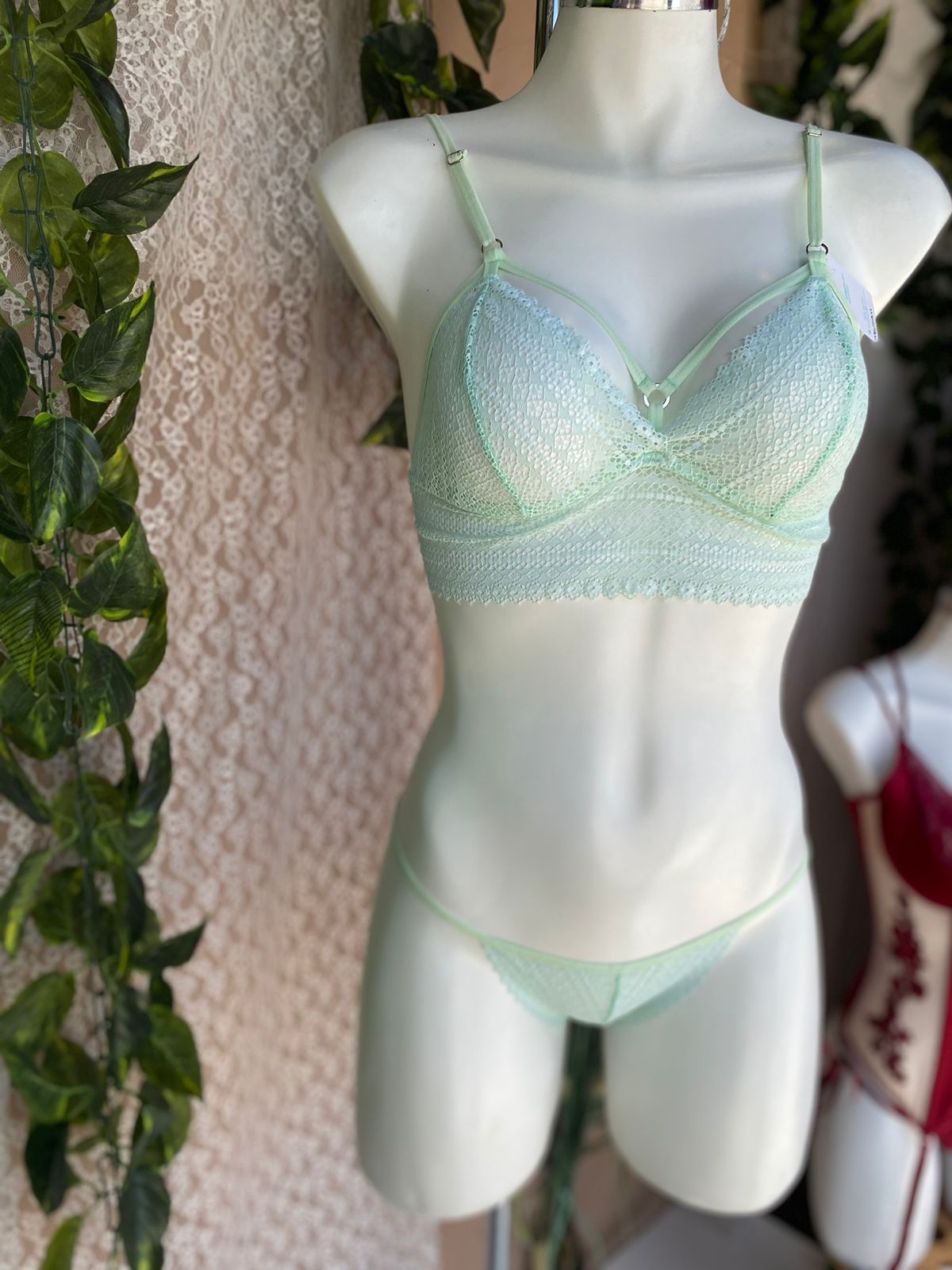 Sexy conjunto de encaje con tiras en el pecho, sin varilla ni copa preformada.