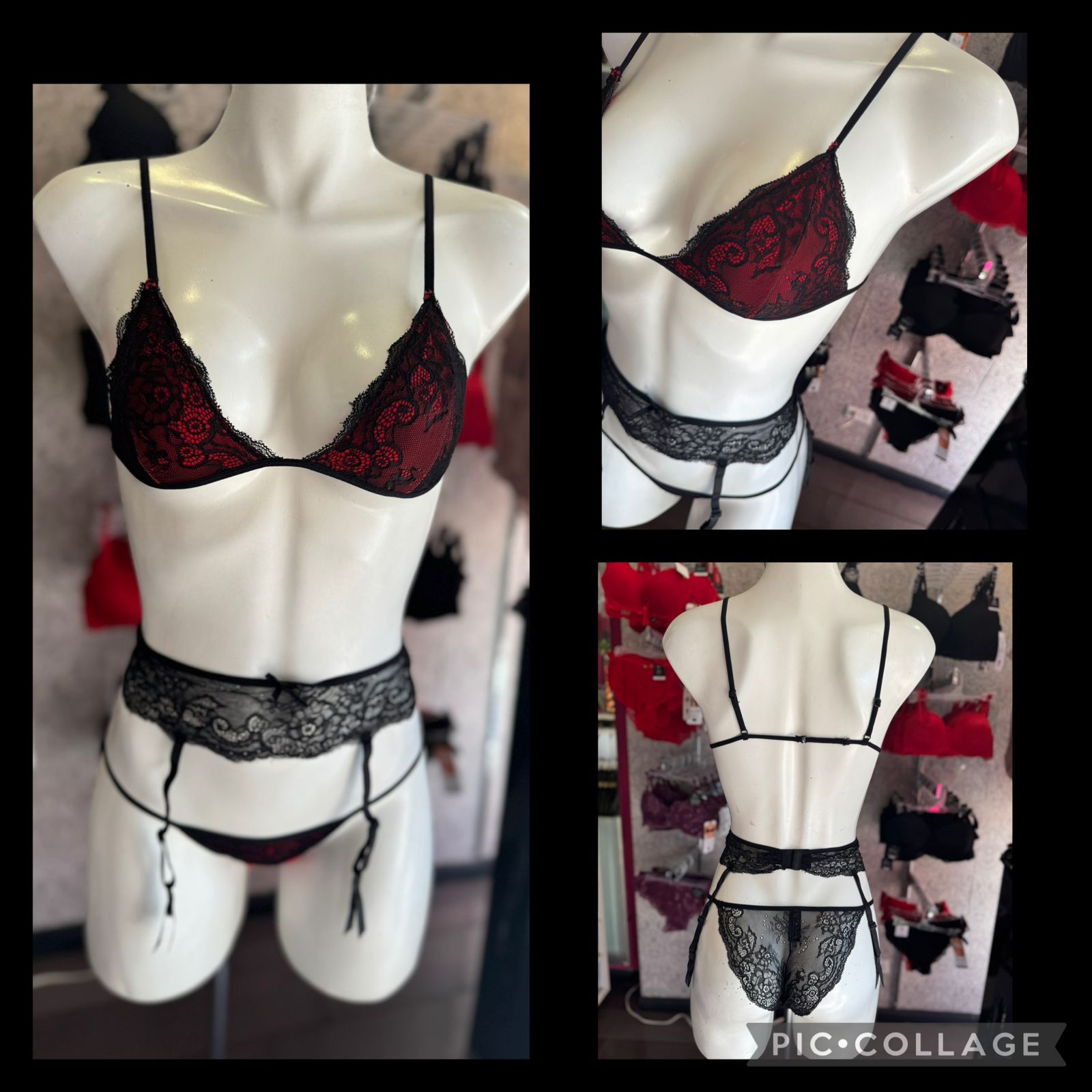 Sexy conjunto de encaje negro con fondo rojo. Incluye liguero y tanga.