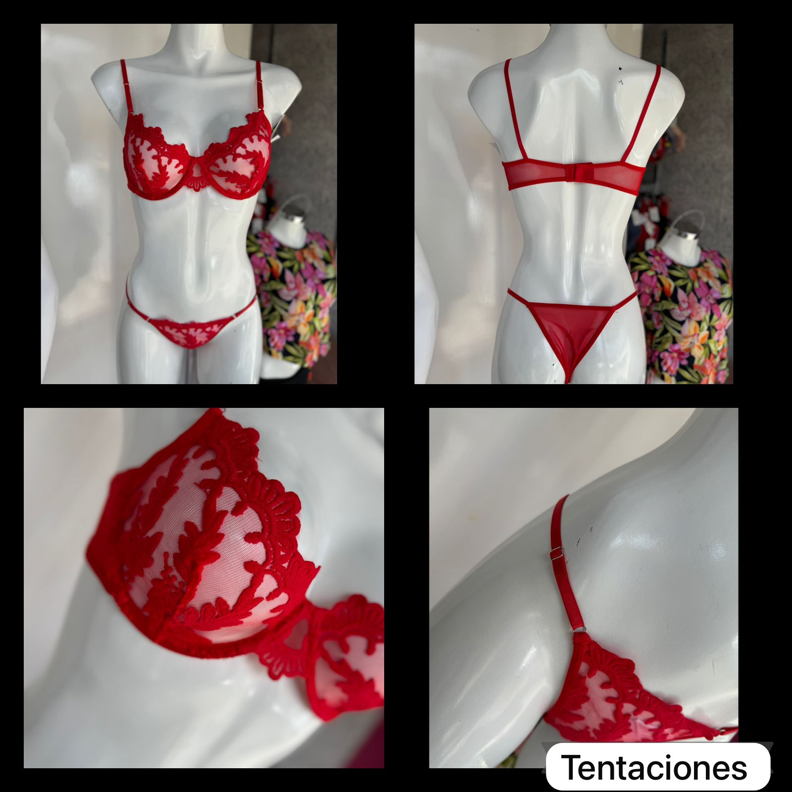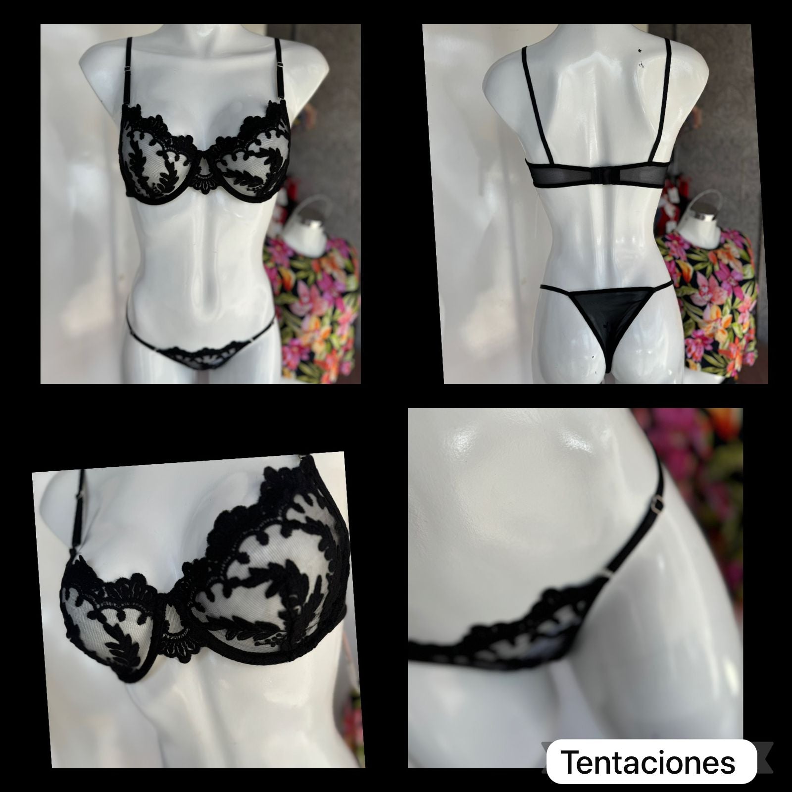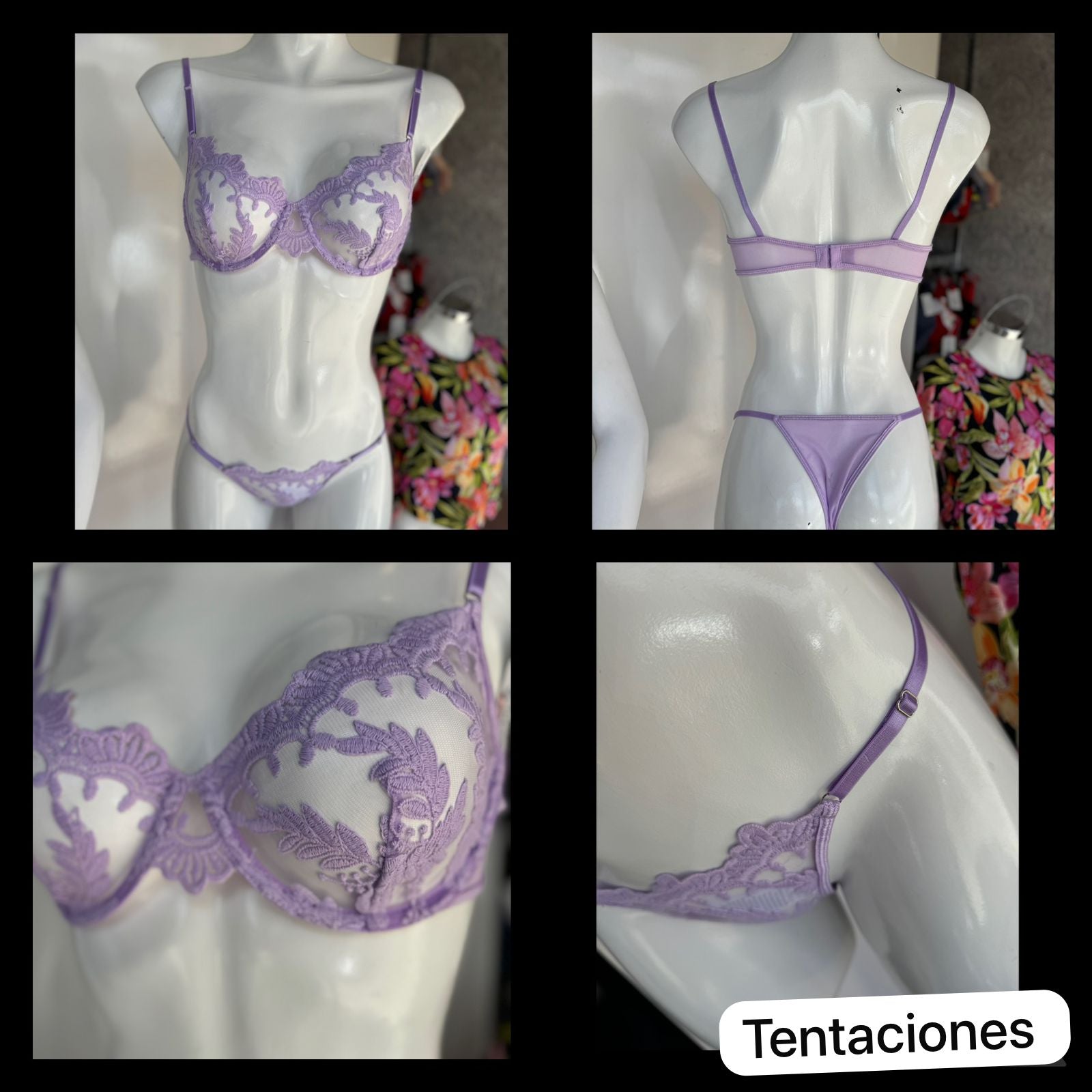 Hermoso conjunto de mesh con detalles de encaje, con tanga ajustables. Varios colores.