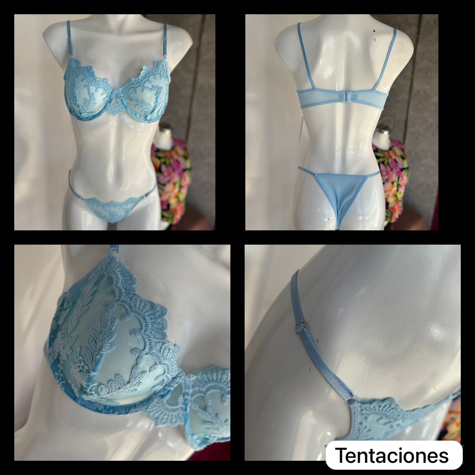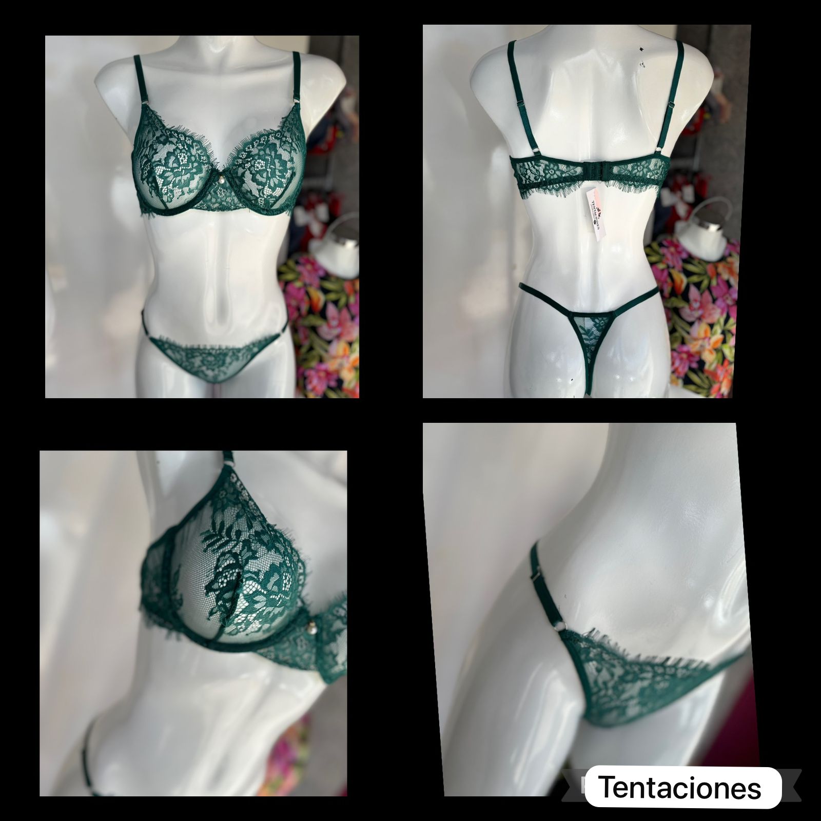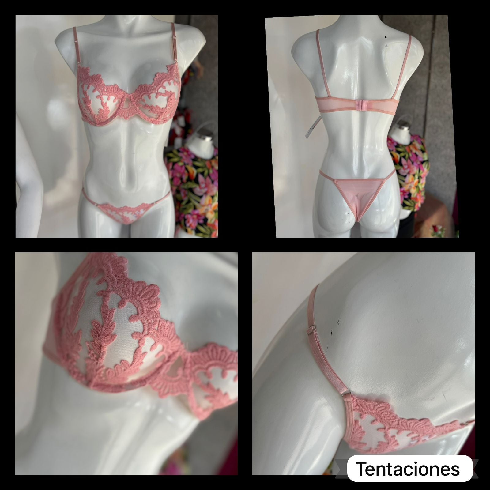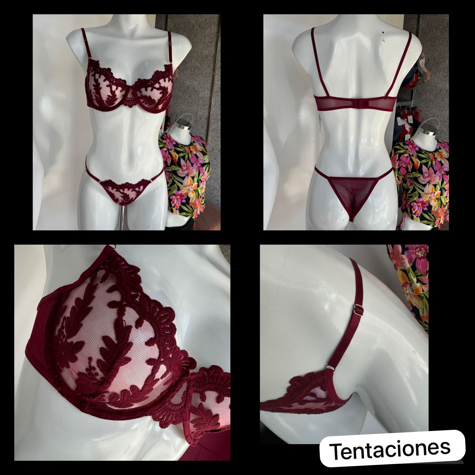 Hermoso conjunto de mesh con detalles de encaje, con tanga ajustables. Varios colores.
