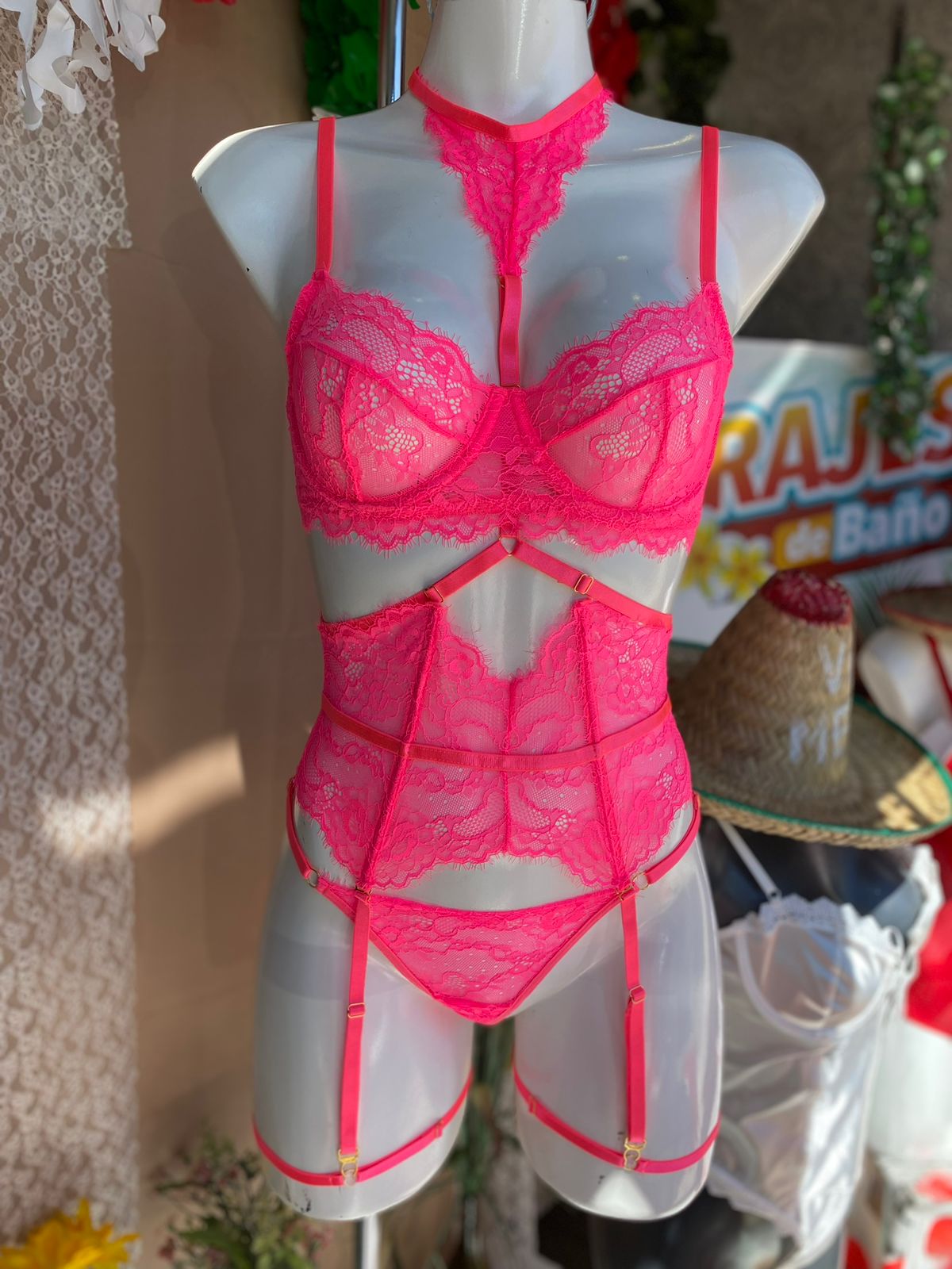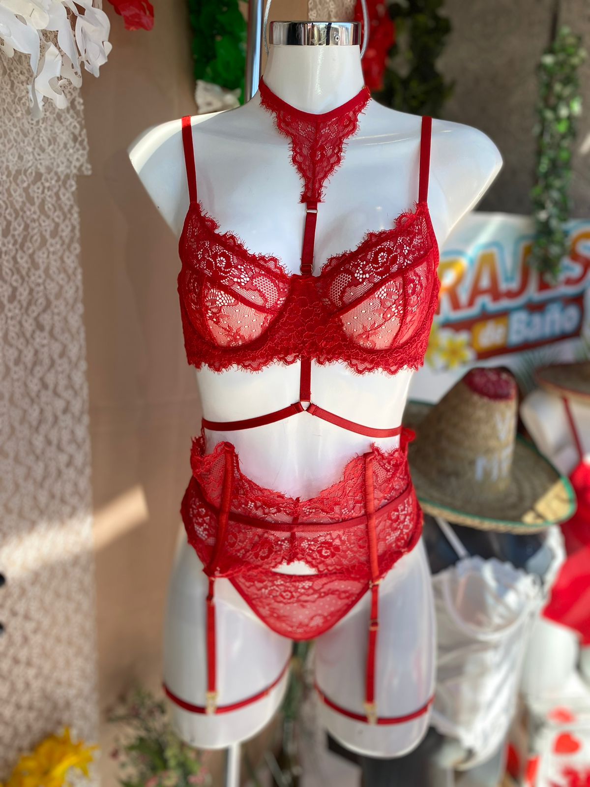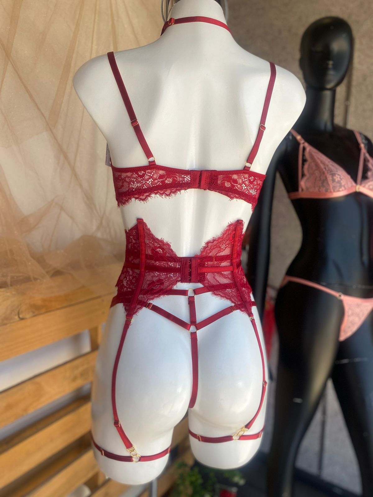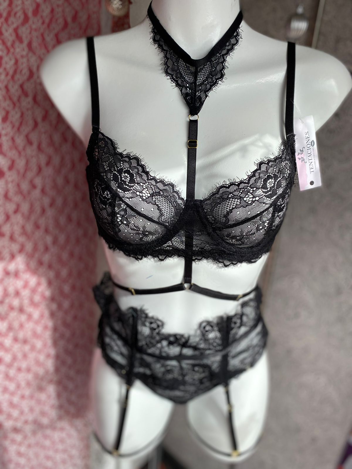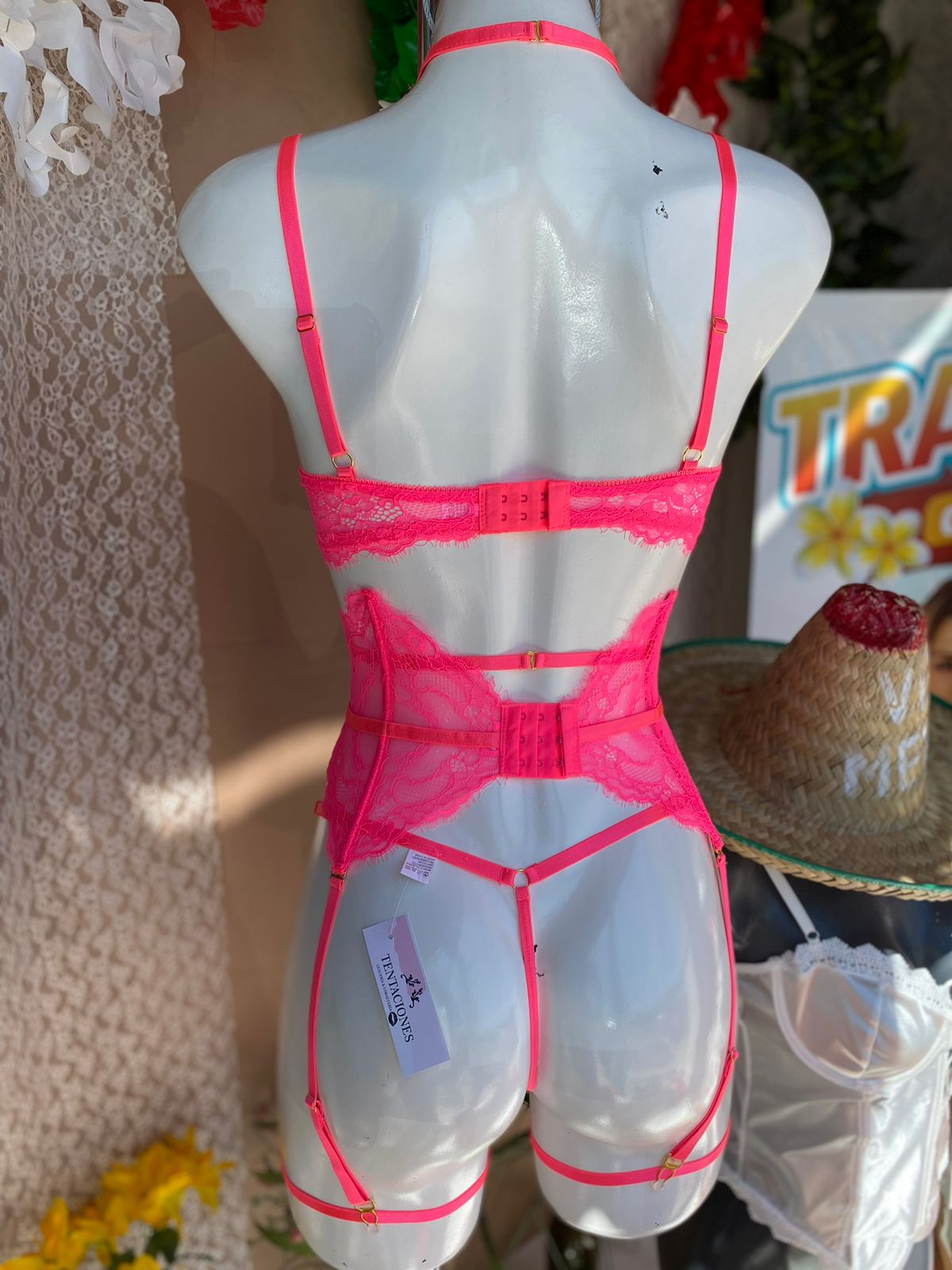 Coqueto coordinado de cinco piezas. Bralette con varilla sin copa pre formada, liguero ancho, accesorio de cuello, tanga ajustable y ligas.