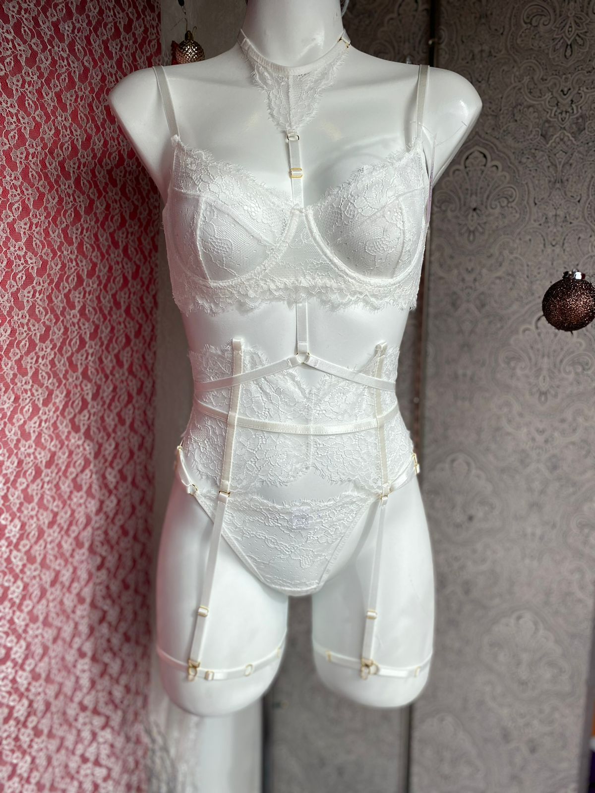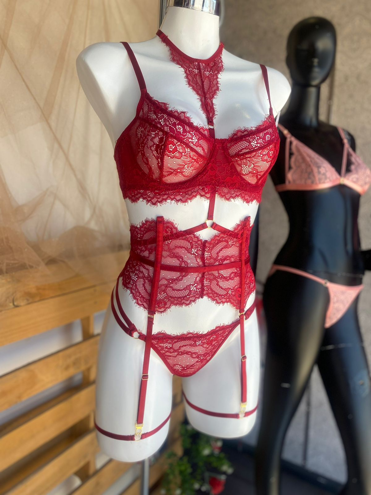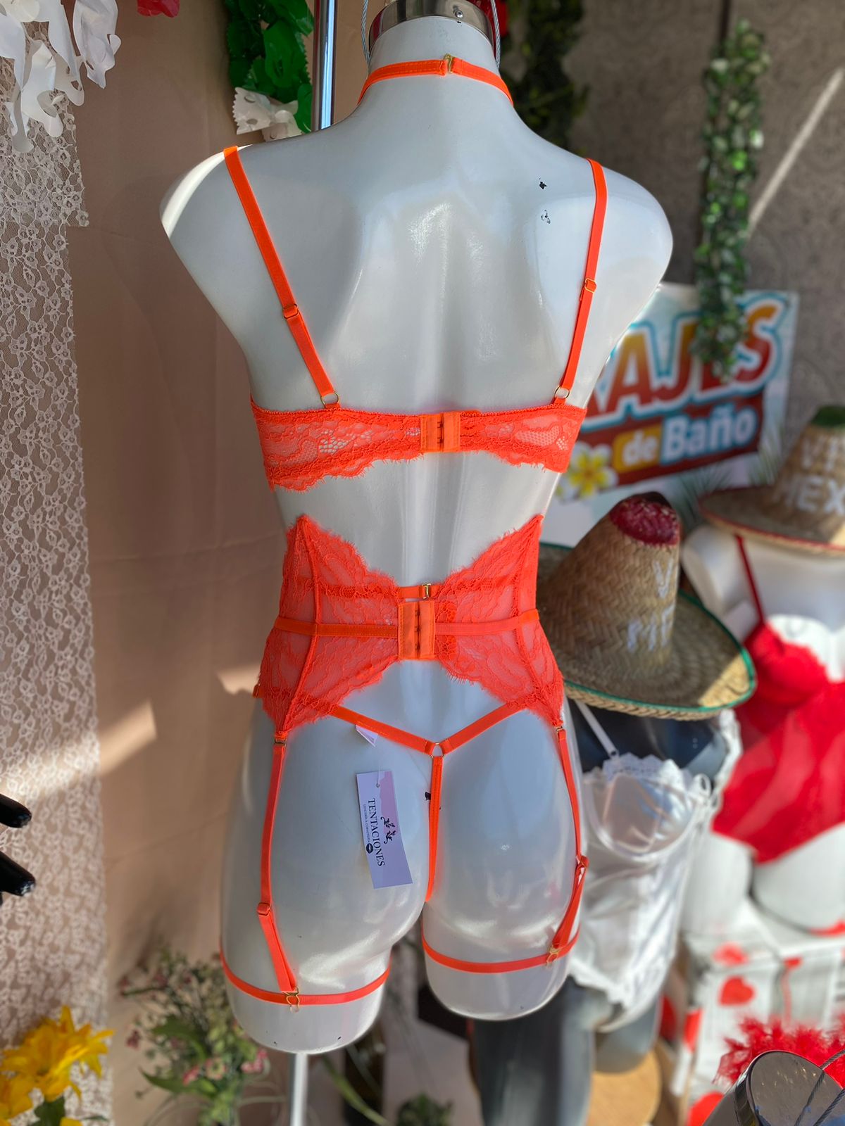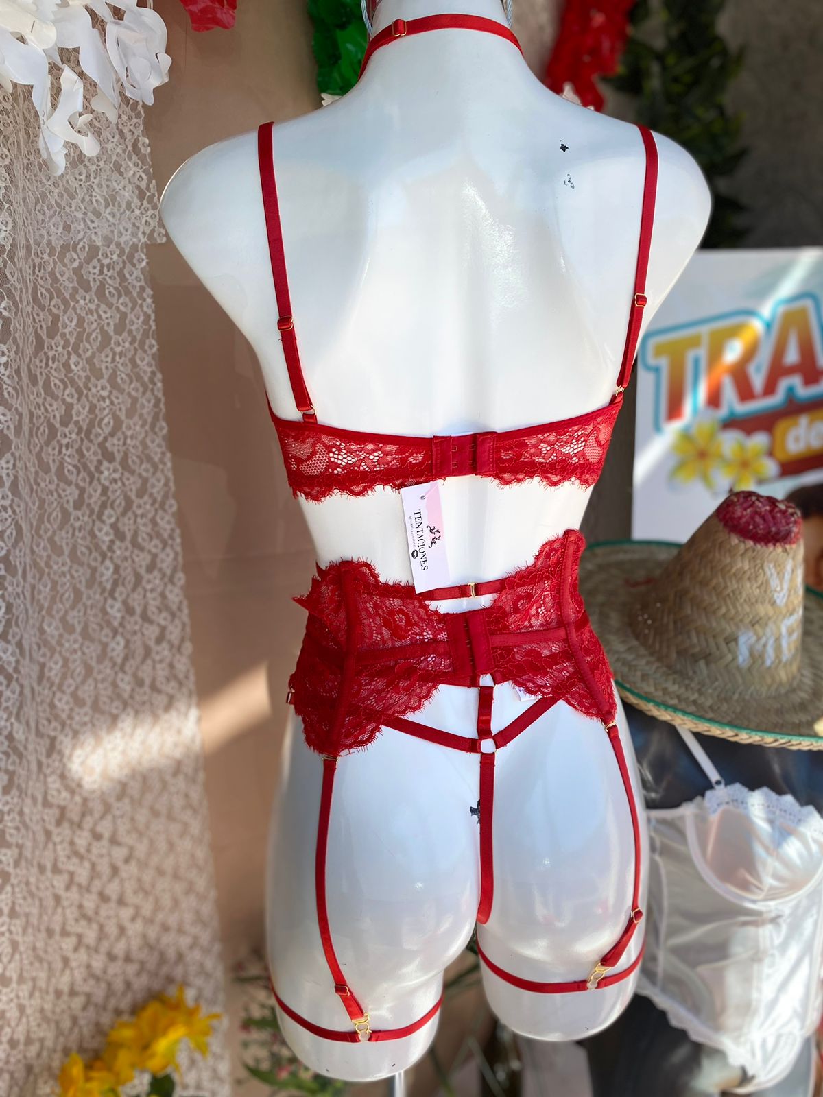 Coqueto coordinado de cinco piezas. Bralette con varilla sin copa pre formada, liguero ancho, accesorio de cuello, tanga ajustable y ligas.