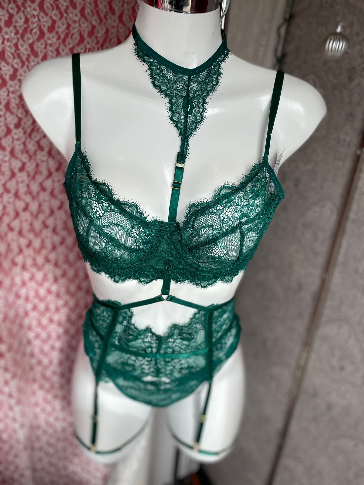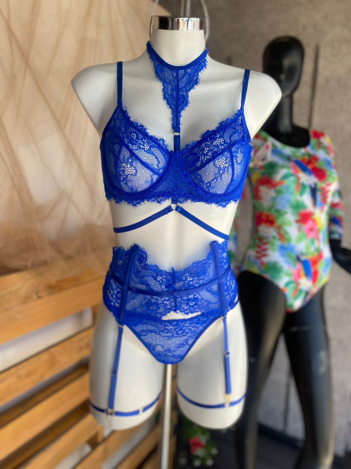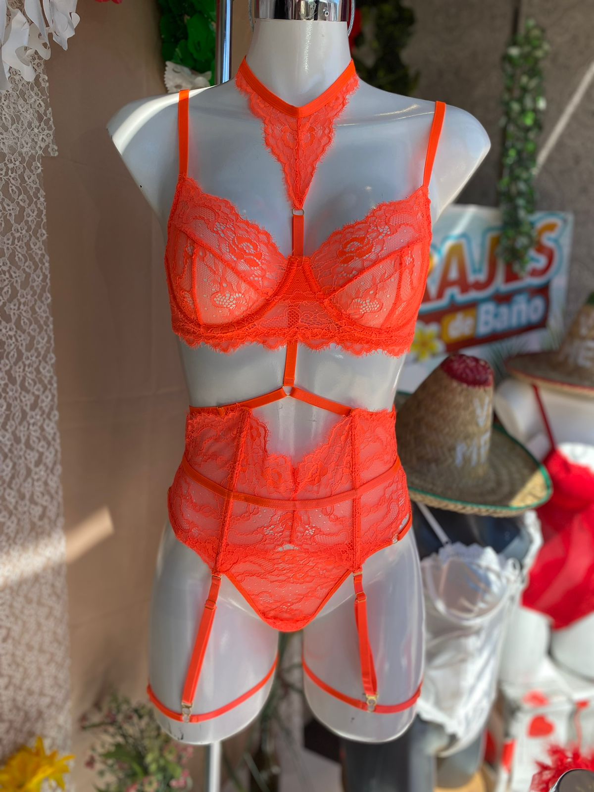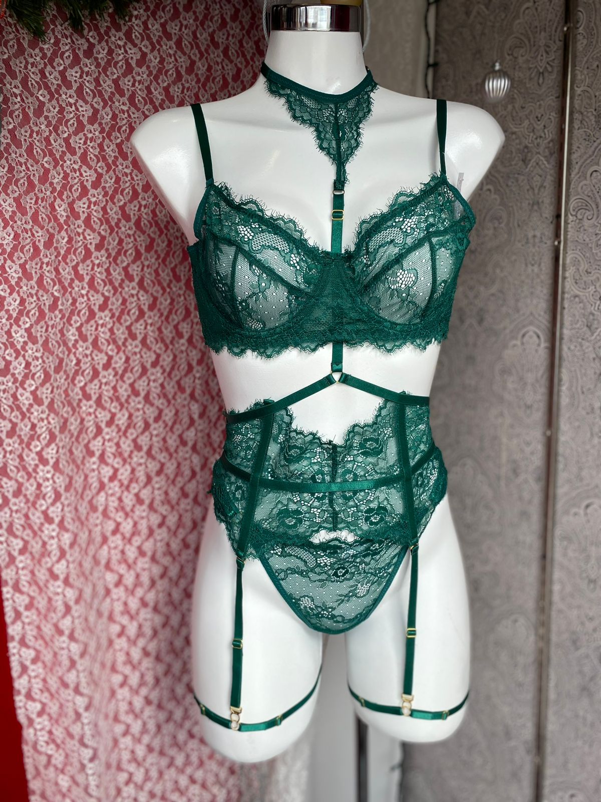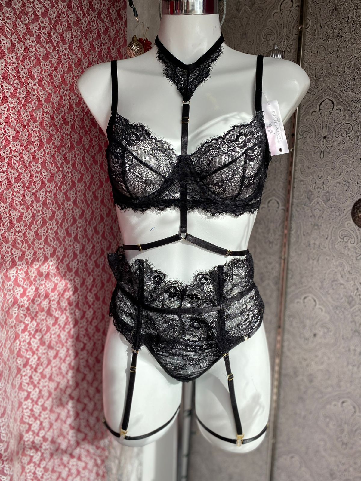 Coqueto coordinado de cinco piezas. Bralette con varilla sin copa pre formada, liguero ancho, accesorio de cuello, tanga ajustable y ligas.