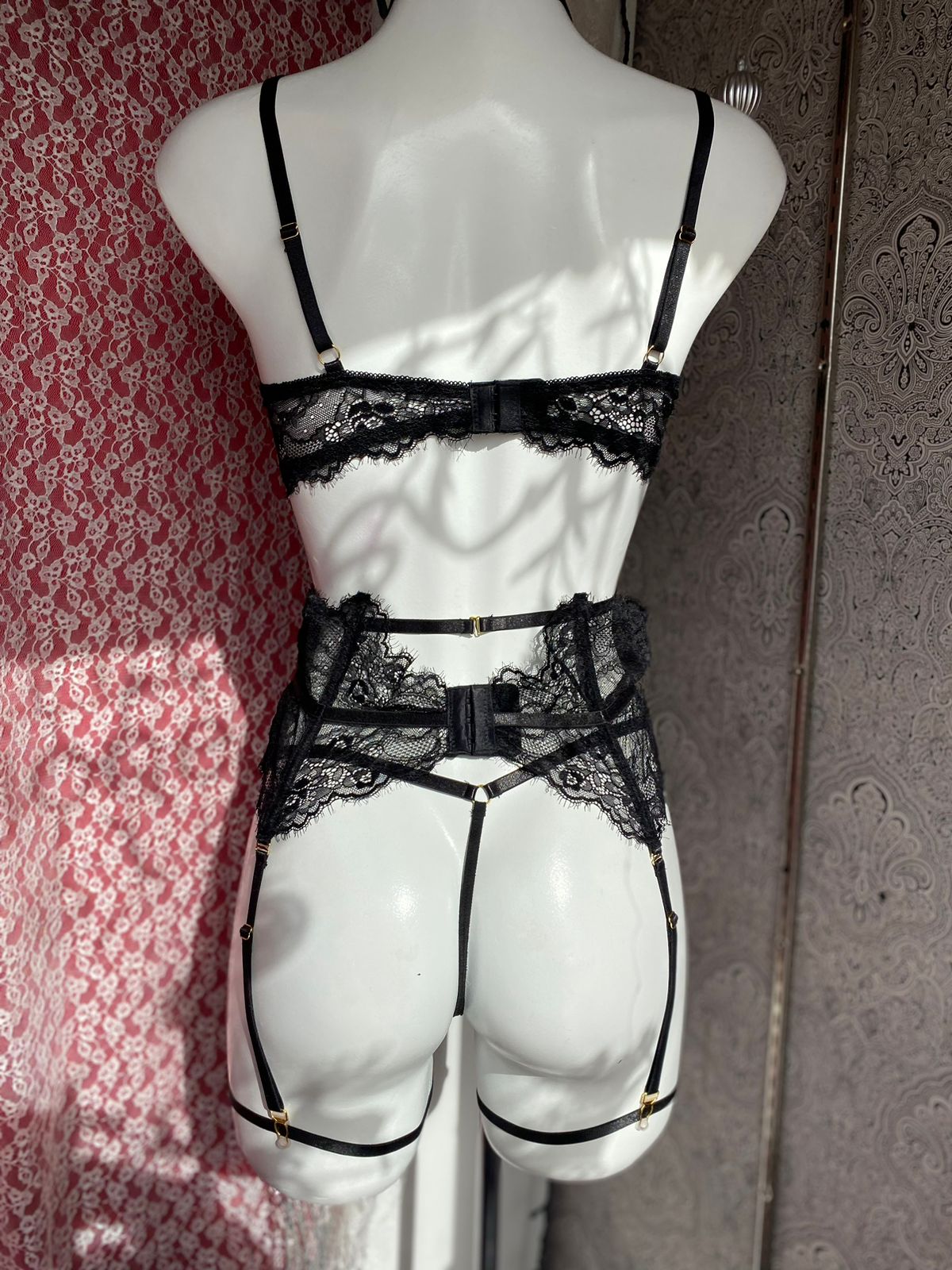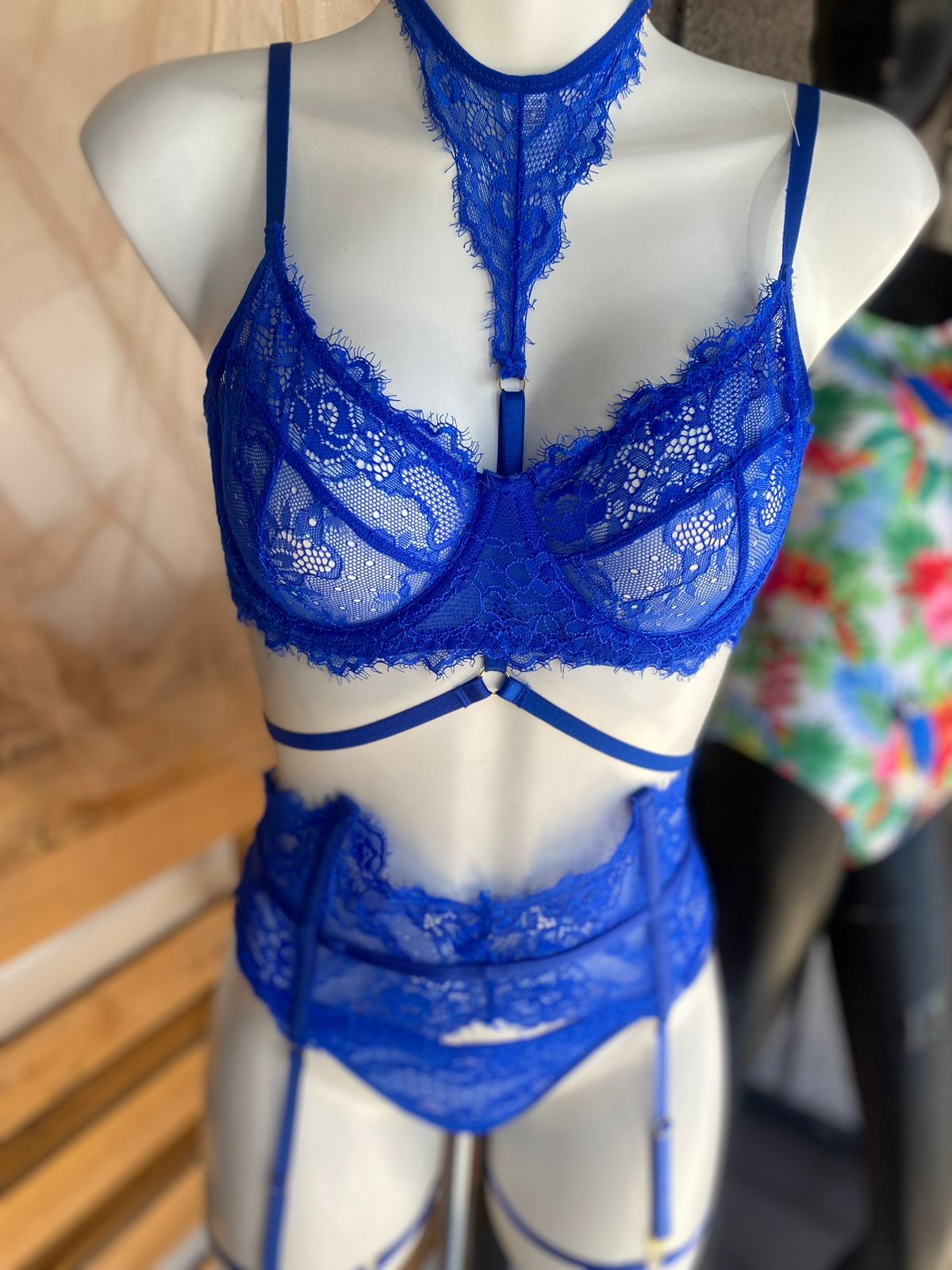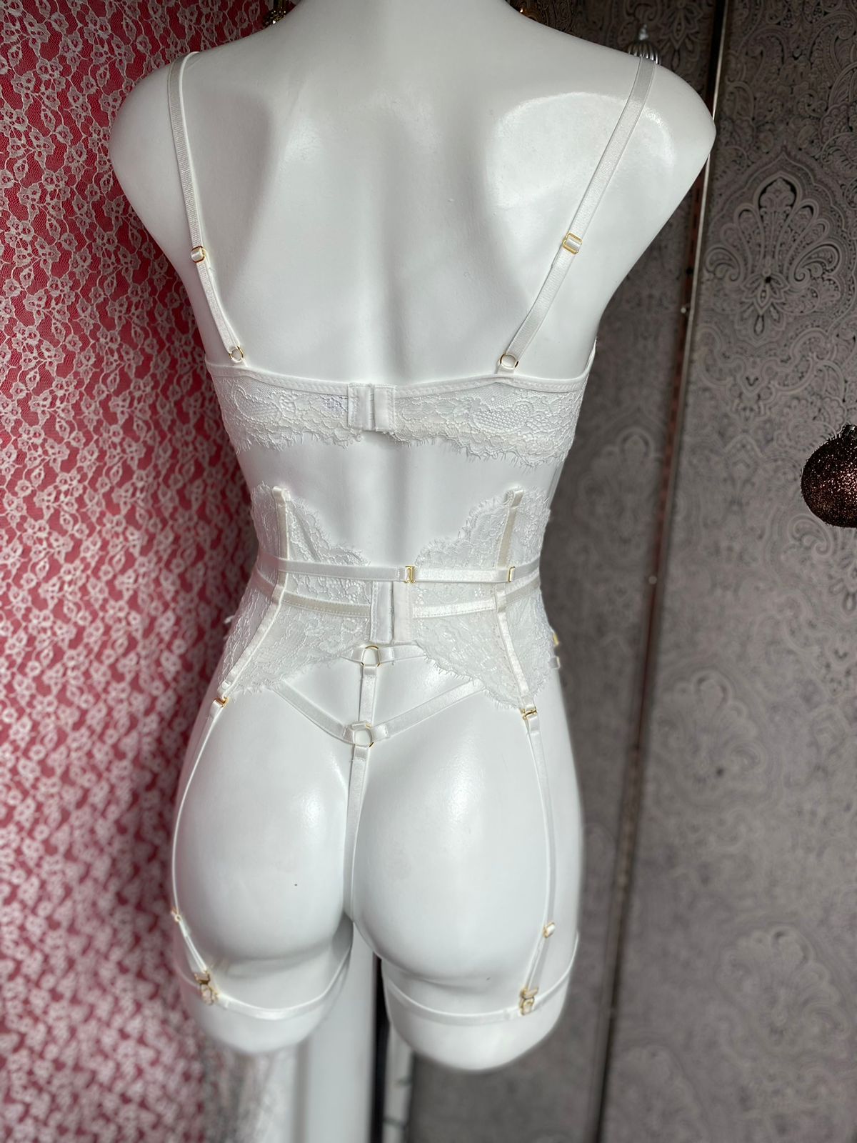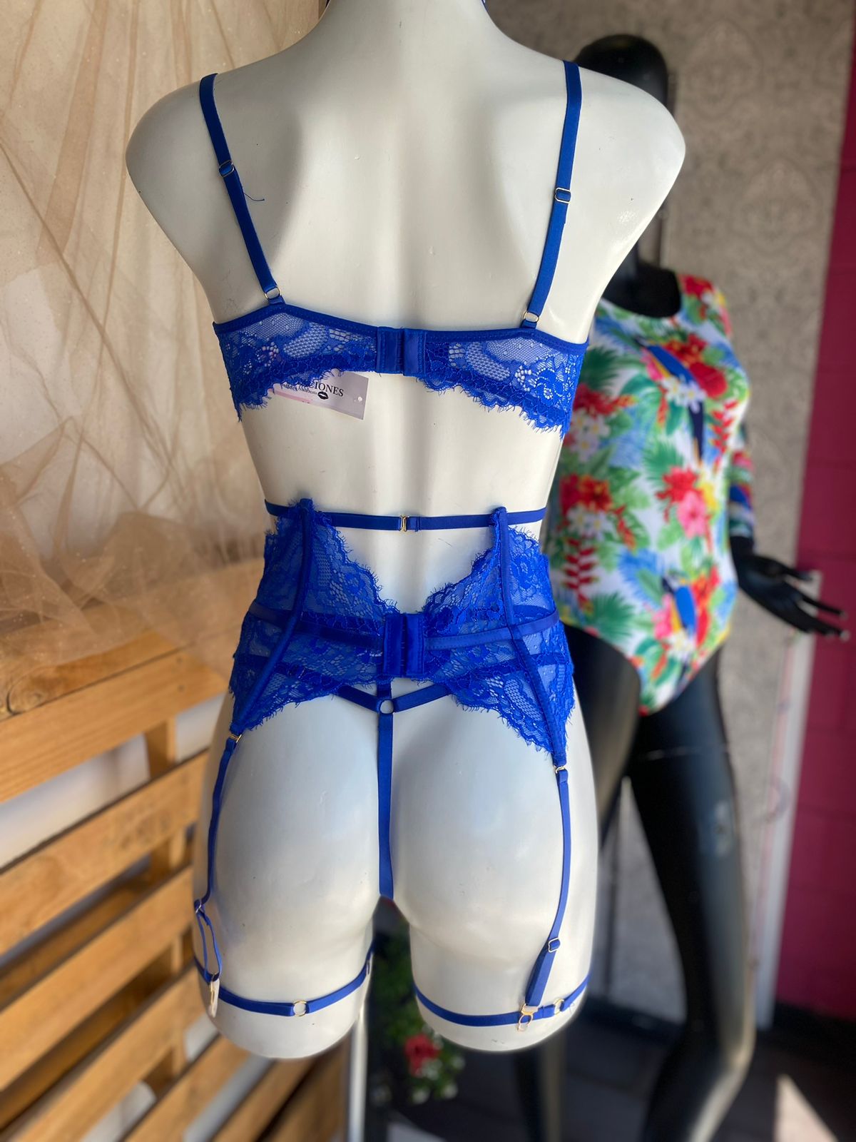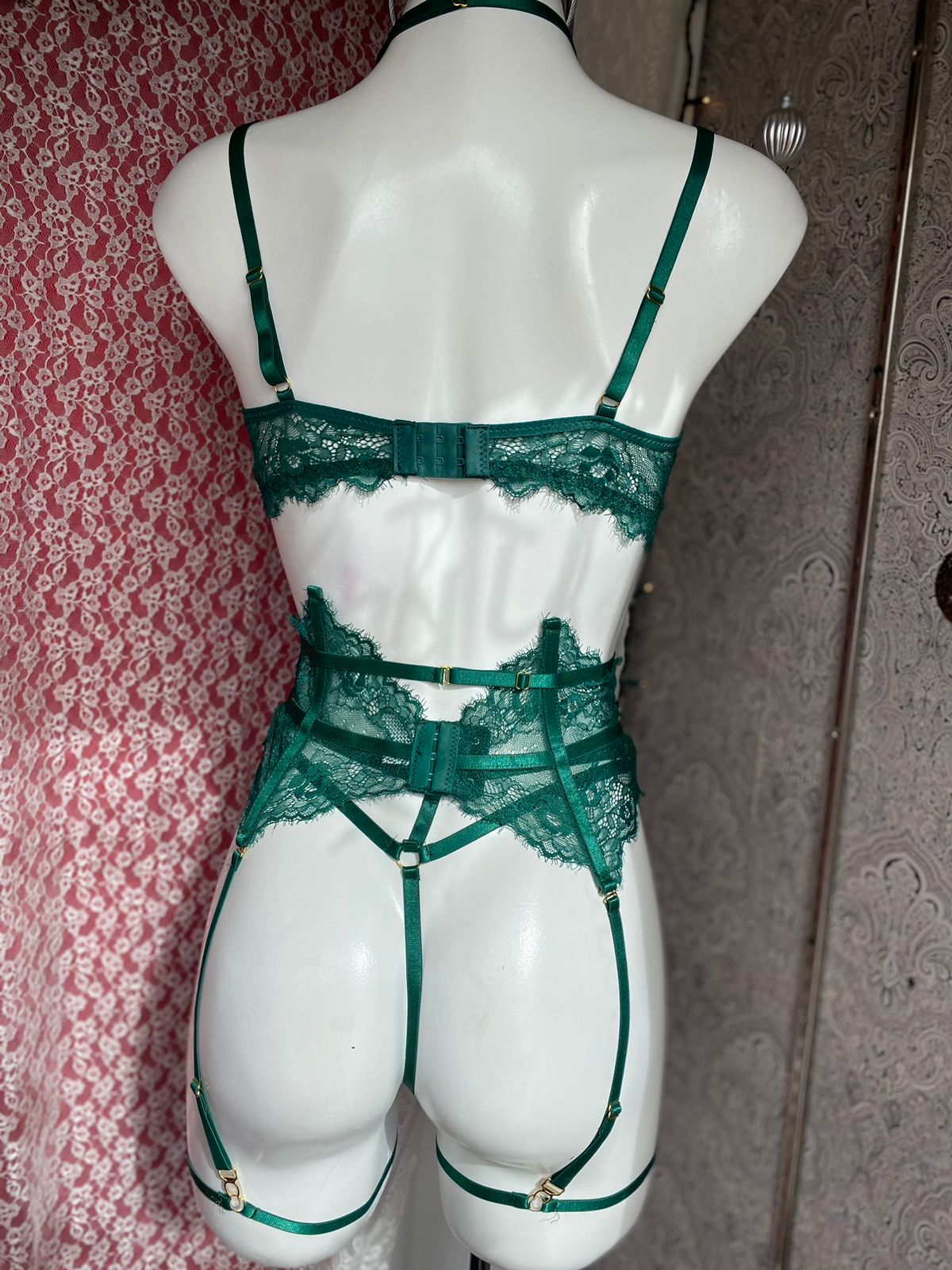 Coqueto coordinado de cinco piezas. Bralette con varilla sin copa pre formada, liguero ancho, accesorio de cuello, tanga ajustable y ligas.
