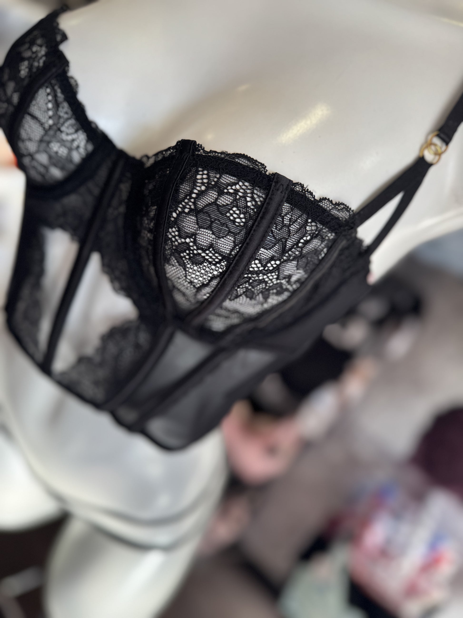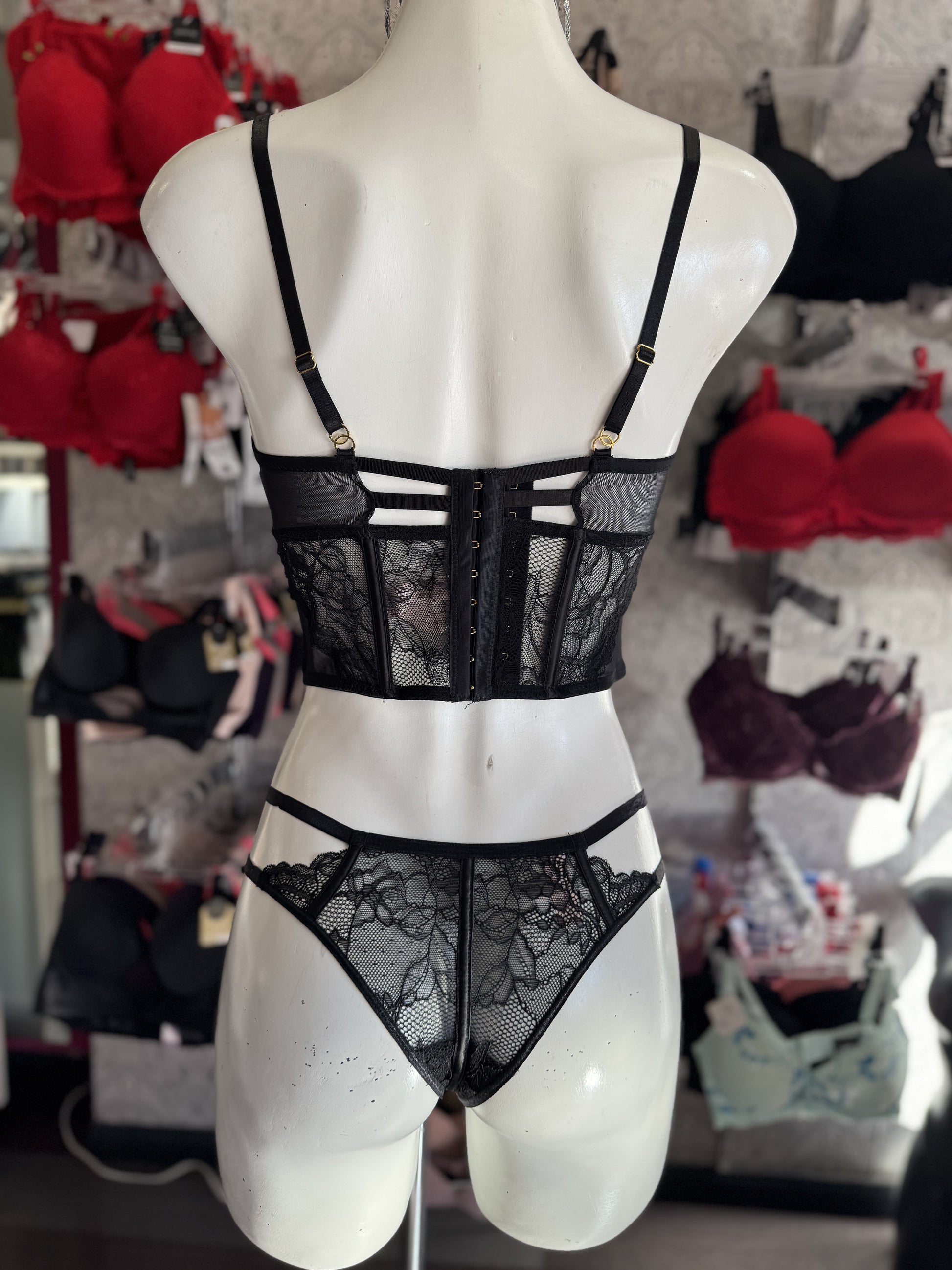 Delicado y a la vez Sexy bra de peto ancho con varilla sin copa coordinado con bikini en negro. Rr 328797-Blk-talla
