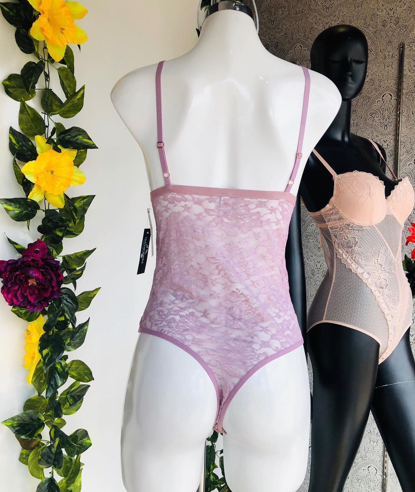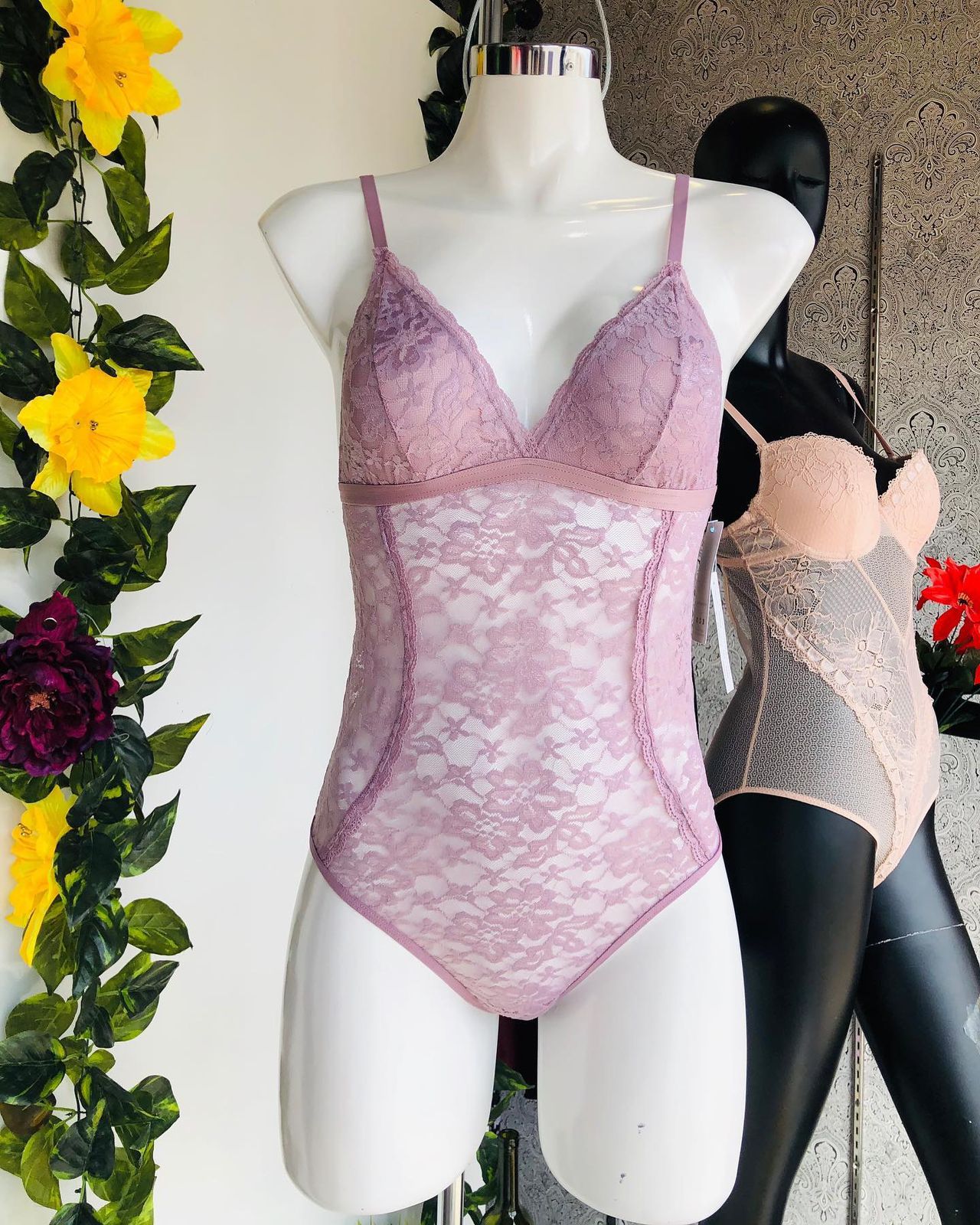 Delicado body de encaje ajustable sin varillas ni copas. En hermoso encaje color lila.