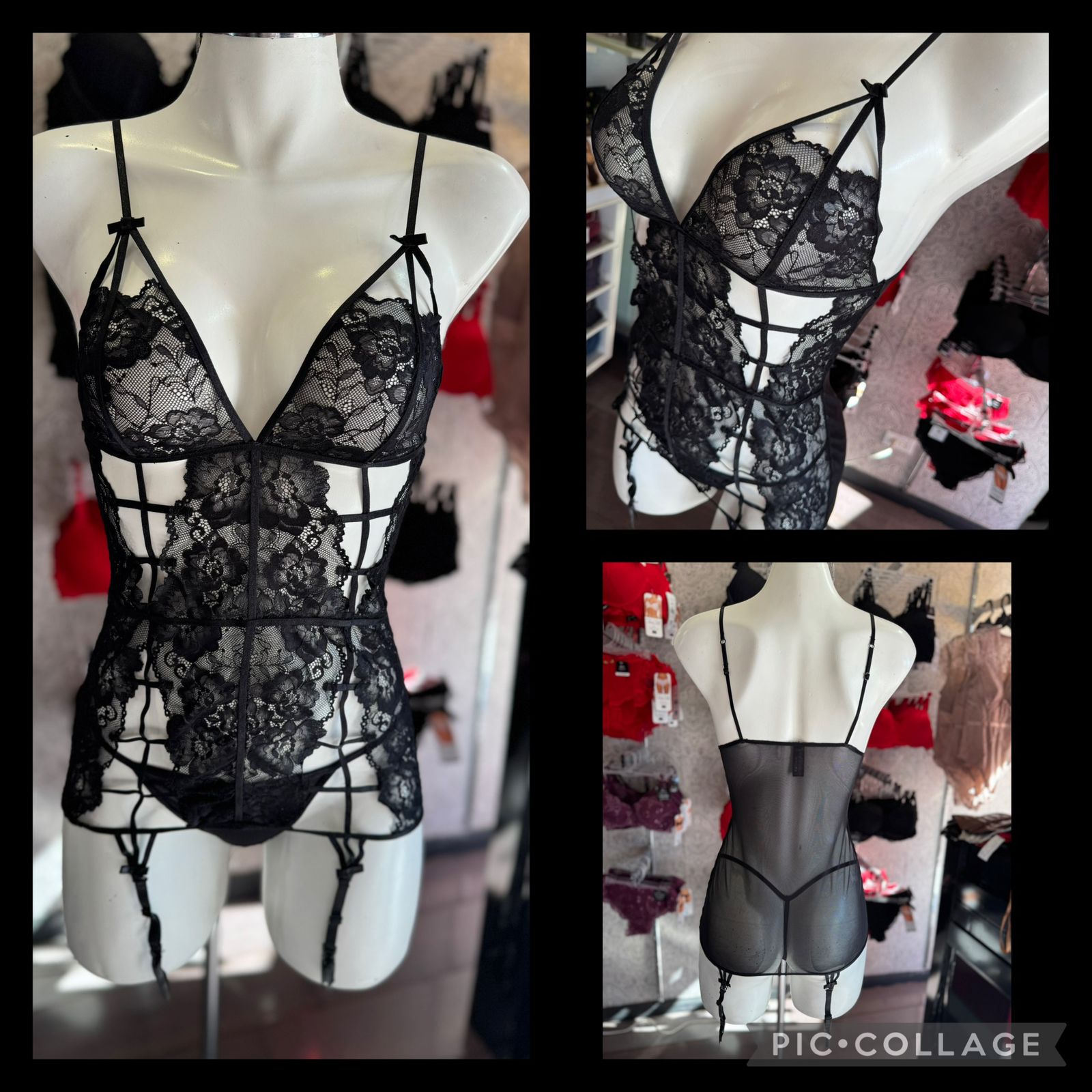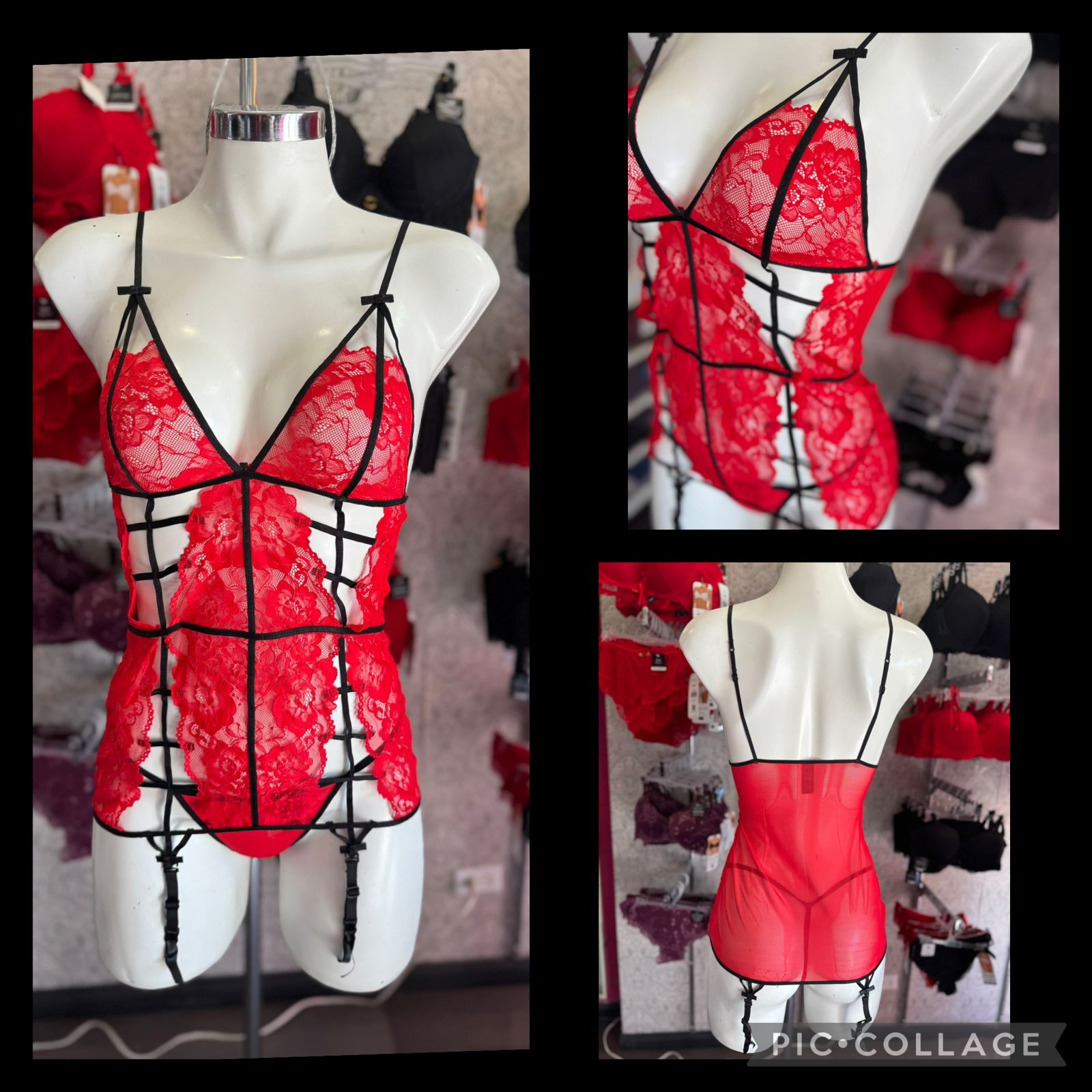 Sexy teddy de cuadros con encaje, sin varilla ni copa. Incluye tanga y liguero. En colores negro o rojo.