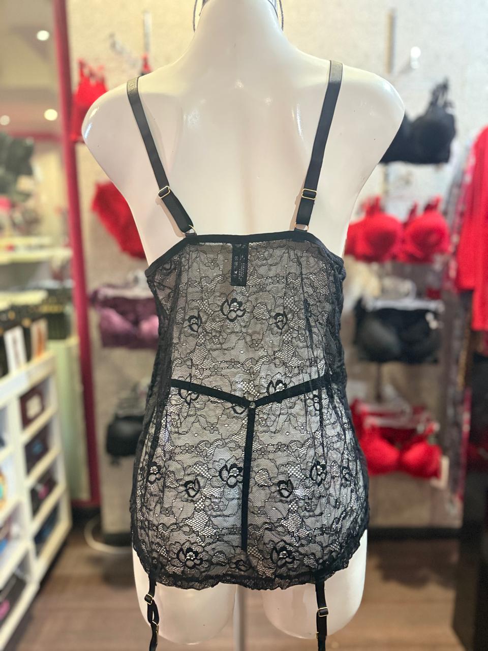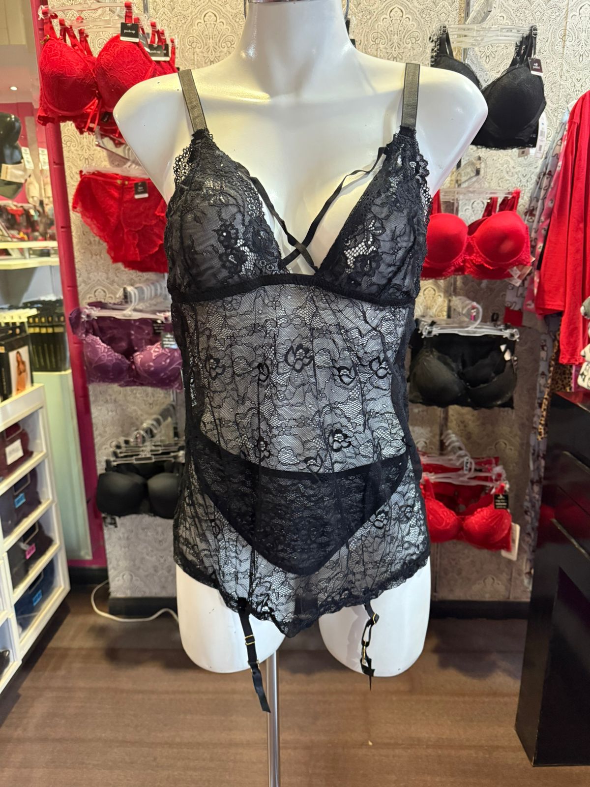 Lindo Teddy de encaje con tiras en el pecho sin copa preformada ni varilla. Con liguero y tanga ajustable. Talla 3x-4x
