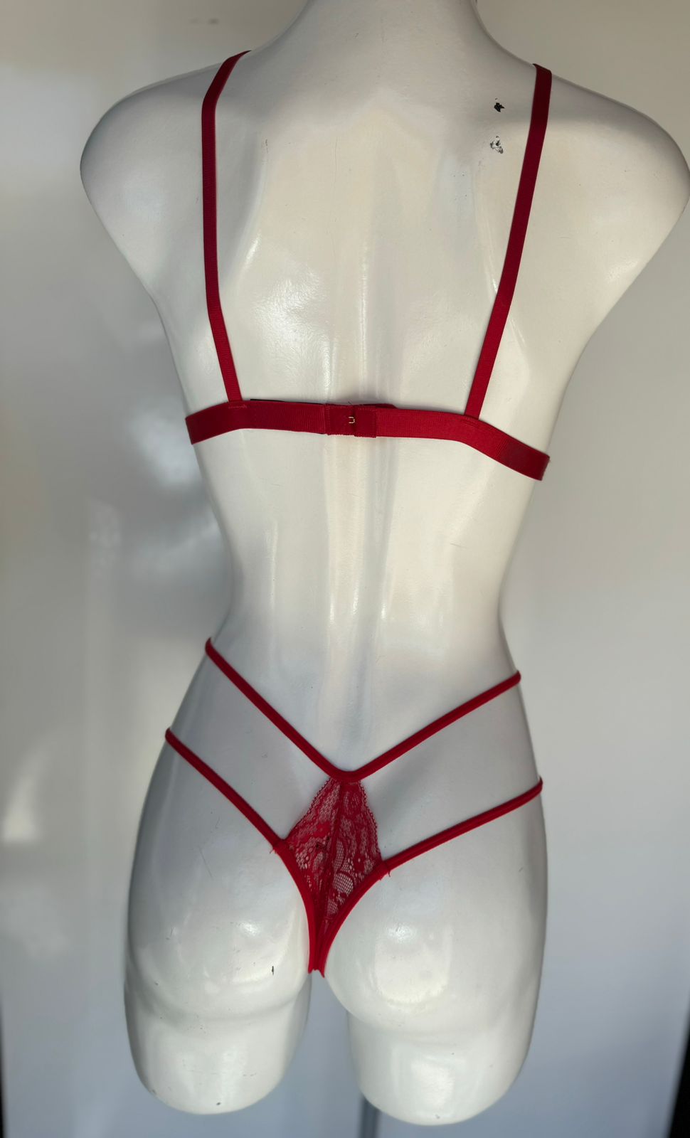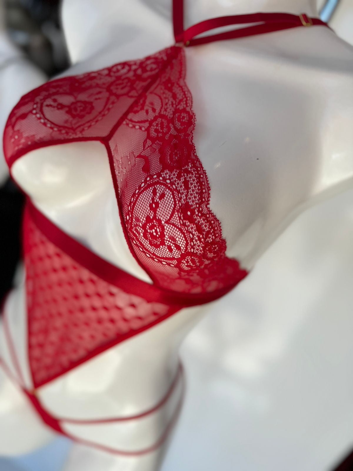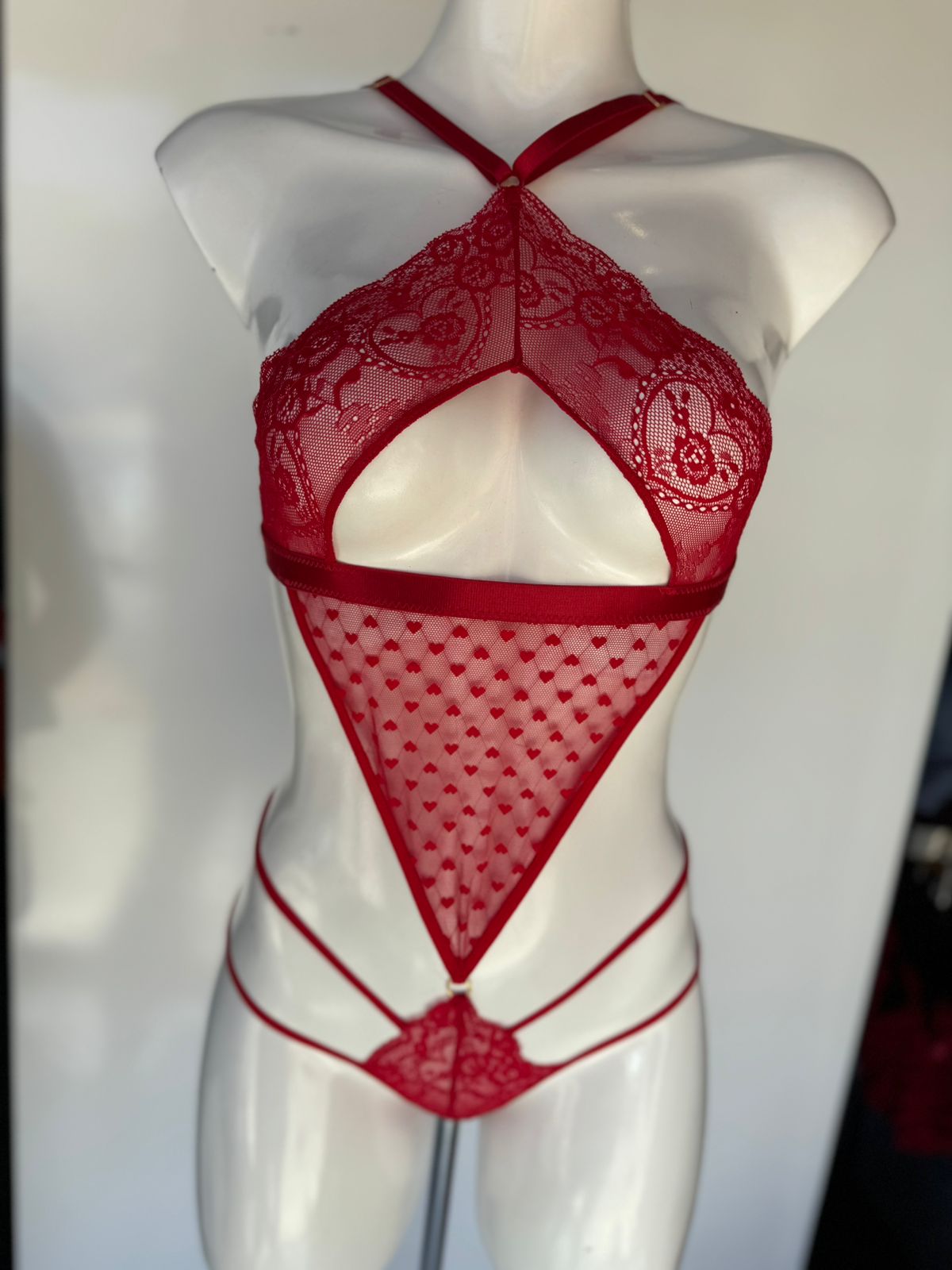 Sexy teddy de mesh de corazones con detalles de encaje. Terminación en tanga.