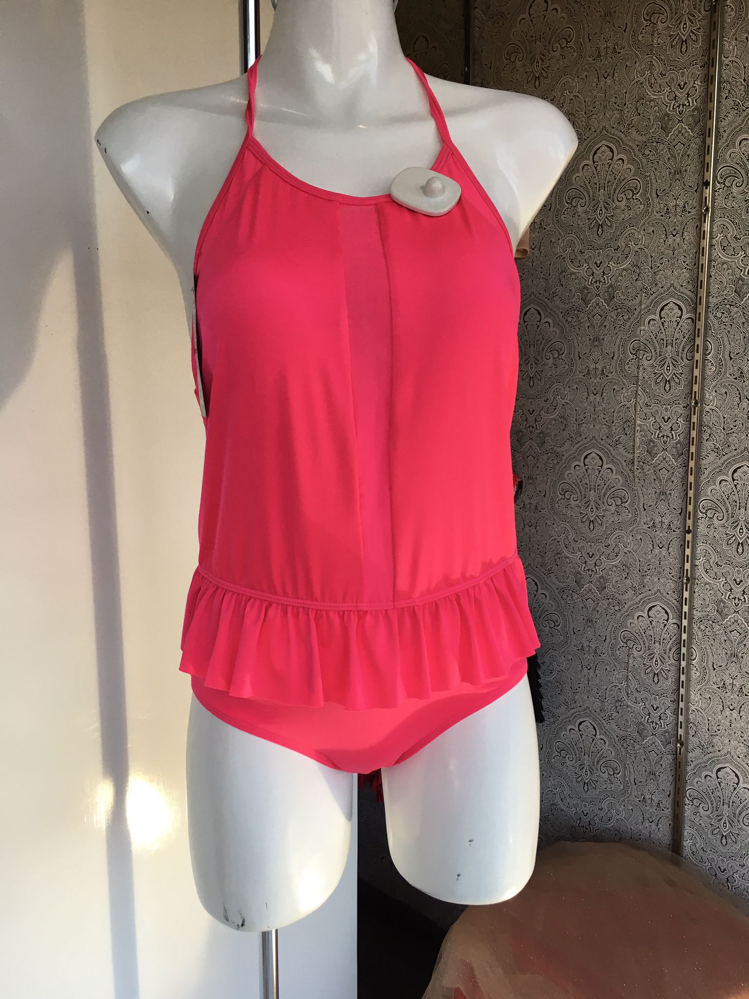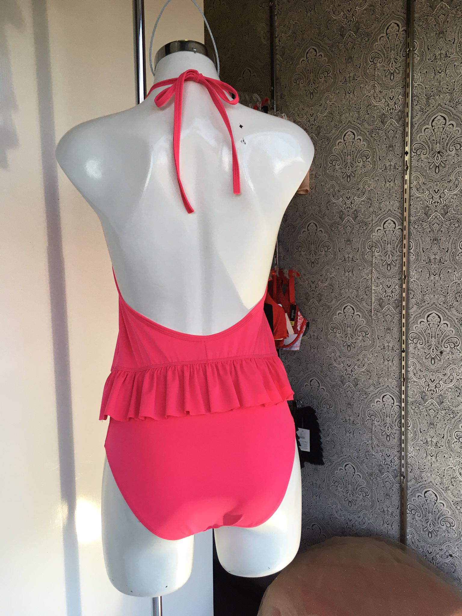 Traje de baño de licra negro con detalle en mesh y olan, con espalda descubierta.